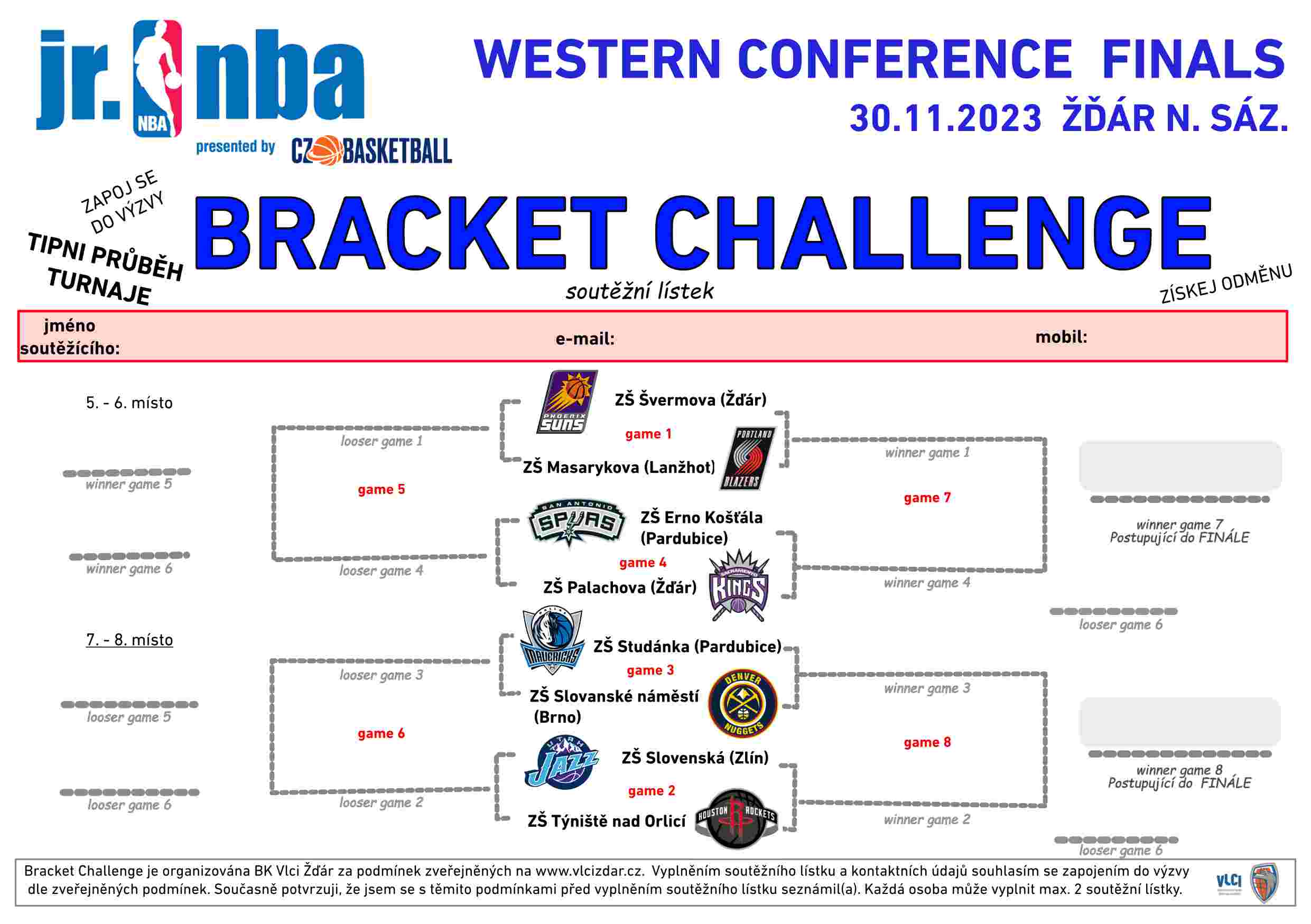 Soutěžní lístky pro „výzvu“ musí být vyplněny a odevzdány nejpozději v den zahájení turnaje (30. 11.) před začátkem prvních utkání (9:00). Soutěžní lístky budou od úterý 28. 11. k dispozici v obou základních školách a zde je možné je také odevzdat do připravených boxů. Druhá možnost je lístky vytisknout a odevzdat od úterý 28. 11. do připraveného boxu v klubové hale BK (Komenského) nebo v hale TJ (na Bouchalkách) před zahájením turnaje. POZOR, do výzvy budou přijaty pouze lístky odevzdané nejpozději ve čtvrtek 30. 11. do 9:00.