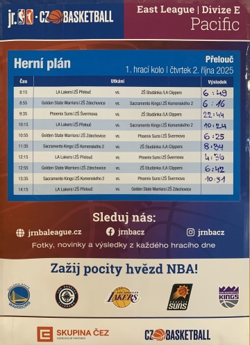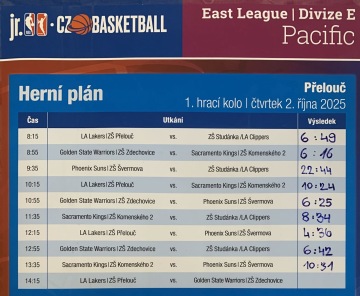 Kings vstoupili do turnaje výhrou nad Golden State Wariors (ZŠ Zdechovice) 16:6. Z vývoje turnaje bylo okamžitě jasné, že náš druhý zápas proti domácímu týmu ZŠ Přelouč hrajícímu v barvách Los Angels Lakers bude klíčový, abychom mohli myslet na postup do dalších ligových kol. Před utkáním jsem hráčům kladl na srdce, že každý vstřelený koš v tomto utkání může být rozhodující, a proto se musíme soustředit a proměňovat každou šanci. Přesně to se nám nedařilo, takže minutu před koncem jsme drželi těsné vedené jen 8:6. Nastalo nevyhnutelné - infarktová koncovka utkání jak vystřižená z přenosů NBA: soupeř podporovaný fandícími spolužáky v zaplněném hledišti nejprve srovnal a z dalšího protiútoku se 24s před koncem utkání dokonce dostal do vedení 8:10. Kings se ale nevzdali a fantastickou střelou Julči Schutové si 3 vteřiny před koncem vybojovali prodloužení. V něm už jasně kralovali Sacramentští Kings a utkání vyhráli 24:10.